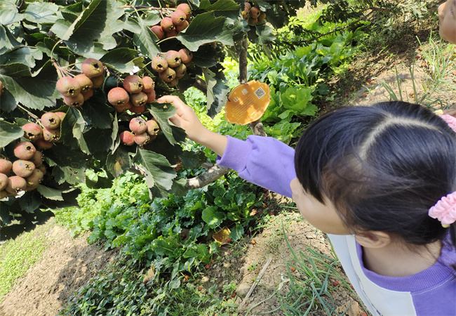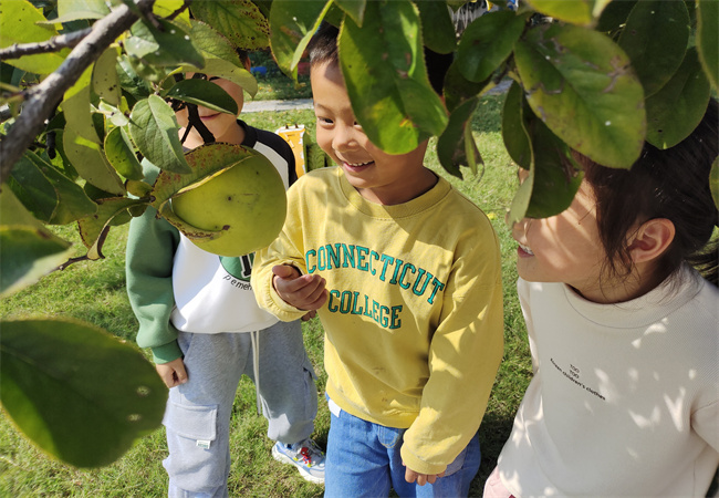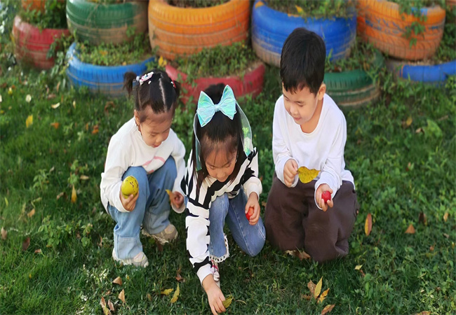 活动中,孩子们在老师的陪伴下,近距离与秋天拥抱,孩子们自由分队,三个一组,五个一群,孩子们在校园各个角落寻找秋天,瞧!金黄色的木瓜,红艳艳的山楂,红彤彤的海棠果,绿油油的蔬菜,随风飞舞的落叶等,孩子们一边走一边看,不时停下来摸一摸,闻一闻,孩子们沉浸在秋天的美景中。老师们不失时机地对孩子们进行环境保护教育,不断增强孩子们的环保意识。